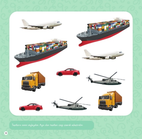 Taşıtların ismini söyleyelim. Aynı olan taşıtları çizgi çizerek eşleştirelim. 38