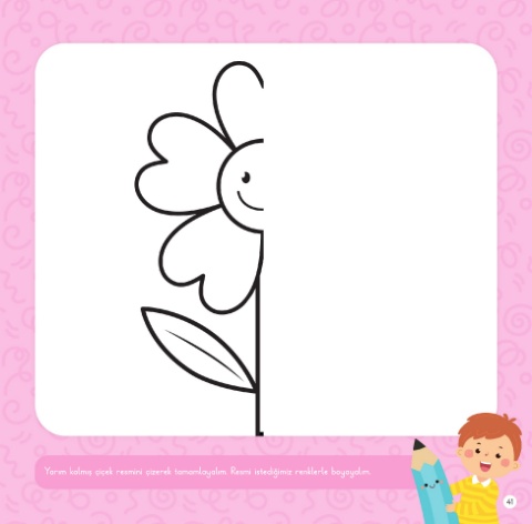 Yarım kalmış çiçek resmini çizerek tamamlayalım. Resmi istediğimiz renklerle boyayalım. 41
