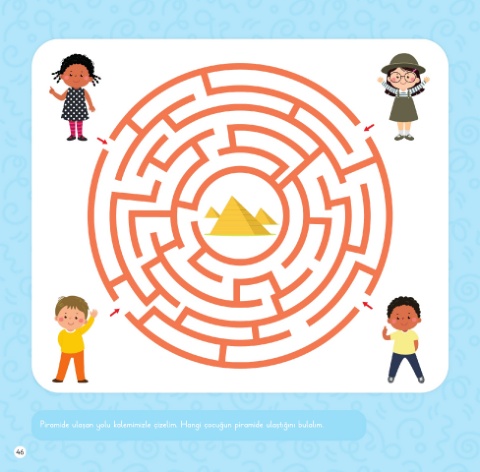 Piramide ulaşan yolu kalemimizle çizelim. Hangi çocuğun piramide ulaştığını bulalım. 46