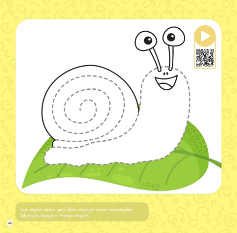 Kesik çizgileri çizerek yarım kalan salyangoz resmini tamamlayalım. Salyangozu boyayalım. Videoyu izleyelim. 48