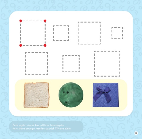 Kesik çizgileri çizerek kare şekillerini tamamlayalım. Kare şekline benzeyen nesneleri yuvarlak (O) içine alalım. 13