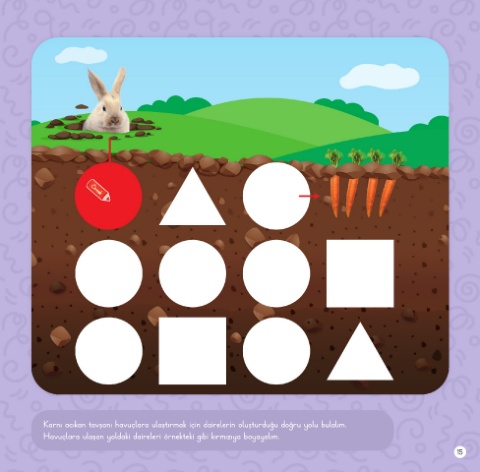 Örnek Karnı acıkan tavşanı havuçlara ulaştırmak için dairelerin oluşturduğu doğru yolu bulalım. Havuçlara ulaşan yoldaki daireleri örnekteki gibi kırmızıya boyayalım. 15