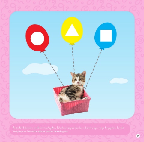 Resimdeki balonların renklerini inceleyelim. Balonların beyaz kısımlarını balonla aynı renge boyayalım. Sevimli kediyi uçuran balonların iplerini çizerek tamamlayalım. 17