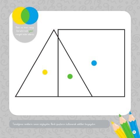 Sarı ve mavi rengi karıştırırsak yeşil rengini elde ederiz. Tanıdığımız renklerin ismini söyleyelim. Renk ipuçlarını kullanarak şekilleri boyayalım. 19