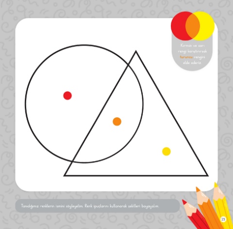 Kırmızı ve sarı rengi karıştırırsak turuncu rengini elde ederiz. Tanıdığımız renklerin ismini söyleyelim. Renk ipuçlarını kullanarak şekilleri boyayalım. 23