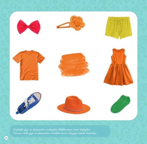 Sayfadaki giysi ve aksesuarları inceleyelim. Bildiklerimizin ismini söyleyelim. Turuncu renkli giysi ve aksesuarları ortadaki turuncu boyaya çizerek ulaştıralım. 24