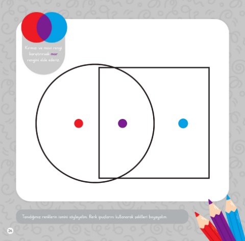 Kırmızı ve mavi rengi karıştırırsak mor rengini elde ederiz. Tanıdığımız renklerin ismini söyleyelim. Renk ipuçlarını kullanarak şekilleri boyayalım. 26