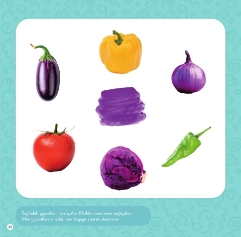 Sayfadaki yiyecekleri inceleyelim. Bildiklerimizin ismini söyleyelim. Mor yiyecekleri ortadaki mor boyaya çizerek ulaştıralım. 28