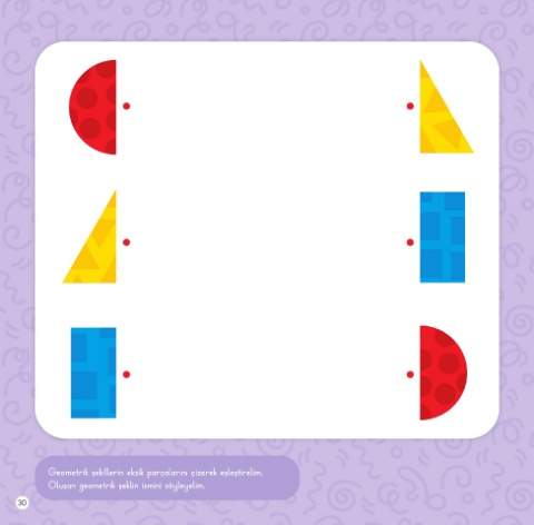 Geometrik şekillerin eksik parçalarını çizerek eşleştirelim. Oluşan geometrik şeklin ismini söyleyelim. 30