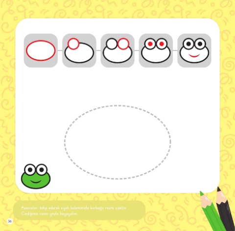 Aşamaları takip ederek siyah kalemimizle kurbağa resmi çizelim. Çizdiğimiz resmi yeşile boyayalım. 36