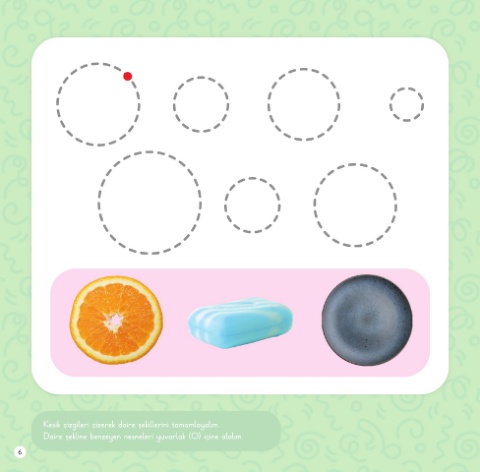 Kesik çizgileri çizerek daire şekillerini tamamlayalım. Daire şekline benzeyen nesneleri yuvarlak (O) içine alalım. 6