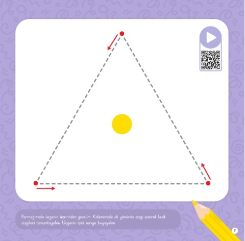Parmağımızla üçgenin üzerinden geçelim. Kalemimizle ok yönünde çizgi çizerek kesik çizgileri tamamlayalım. Üçgenin içini sarıya boyayalım. 7