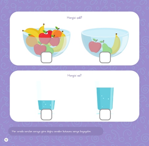Hangisi çok? Hangisi az? Her sırada sorulan soruya göre doğru cevabın kutusunu sarıya boyayalım. 10