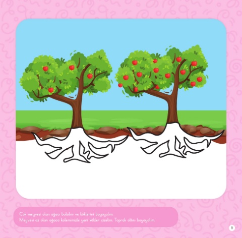 Çok meyvesi olan ağacı bulalım ve köklerini boyayalım. Meyvesi az olan ağaca kalemimizle yeni kökler çizelim. Toprak altını boyayalım. 11