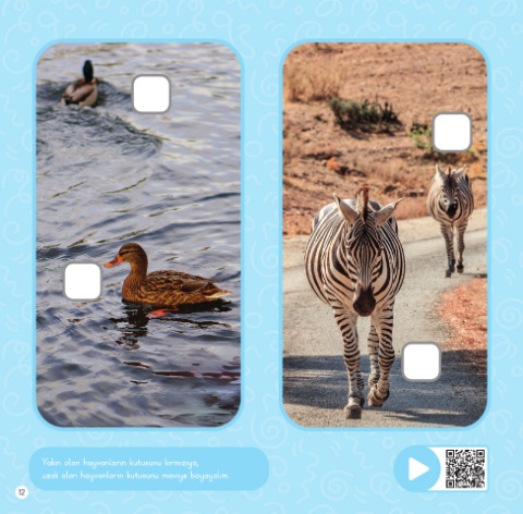Yakın olan hayvanların kutusunu kırmızıya, uzak olan hayvanların kutusunu maviye boyayalım. 12