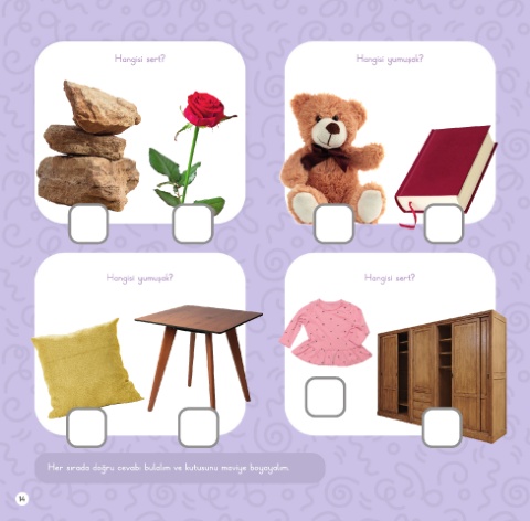 Hangisi sert? Hangisi yumuşak? Hangisi yumuşak? Hangisi sert? Her sırada doğru cevabı bulalım ve kutusunu maviye boyayalım. 14