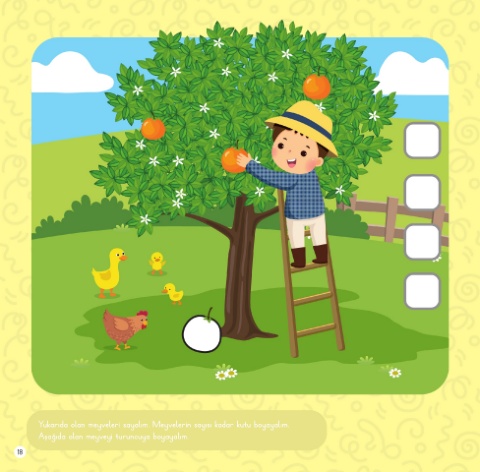 Yukarıda olan meyveleri sayalım. Meyvelerin sayısı kadar kutu boyayalım. Aşağıda olan meyveyi turuncuya boyayalım. 18