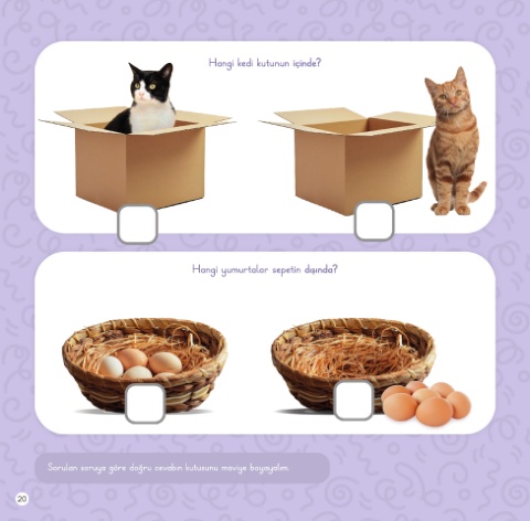 Hangi kedi kutunun içinde? Hangi yumurtalar sepetin dışında? Sorulan soruya göre doğru cevabın kutusunu maviye boyayalım. 20