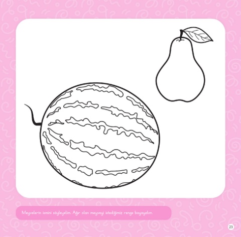 Meyvelerin ismini söyleyelim. Ağır olan meyveyi istediğimiz renge boyayalım. 23