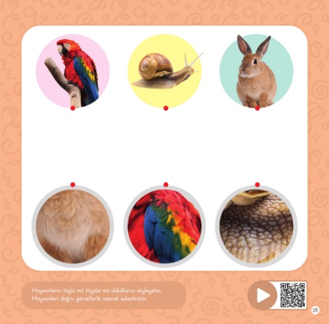 Hayvanların tüylü mü tüysüz mü olduklarını söyleyelim. Hayvanları doğru görsellerle çizerek eşleştirelim. 25