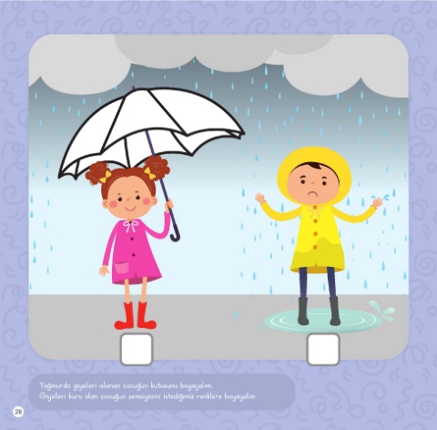 Yağmurda giysileri ıslanan çocuğun kutusunu boyayalım. Giysileri kuru olan çocuğun şemsiyesini istediğimiz renklere boyayalım. 28