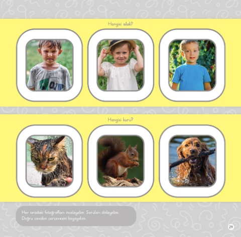 Hangisi ıslak? Hangisi kuru? Her sıradaki fotoğrafları inceleyelim. Soruları dinleyelim. Doğru cevabın çerçevesini boyayalım. 29