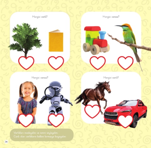 Hangisi canlı? Hangisi cansız? Hangisi cansız? Hangisi canlı? Varlıkları inceleyelim ve ismini söyleyelim. Canlı olan varlıkların kalbini kırmızıya boyayalım. 34