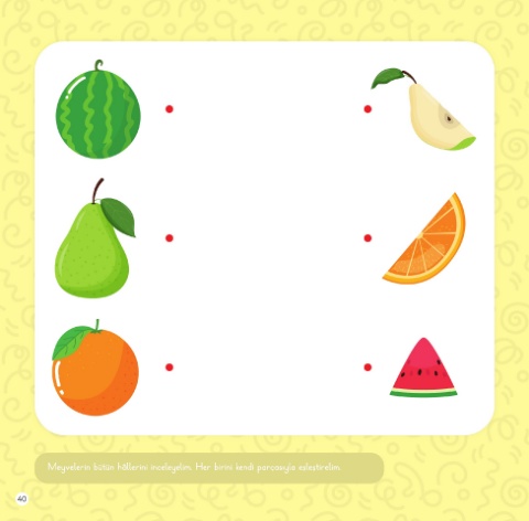 Meyvelerin bütün hâllerini inceleyelim. Her birini kendi parçasıyla eşleştirelim. 40