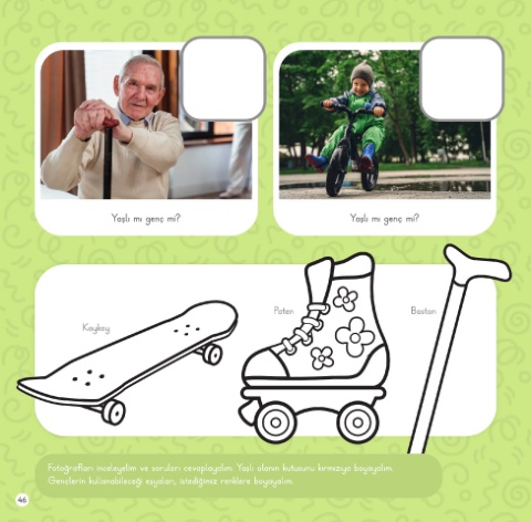 Yaşlı mı genç mi? Yaşlı mı genç mi? Paten Baston Kaykay Fotoğrafları inceleyelim ve soruları cevaplayalım. Yaşlı olanın kutusunu kırmızıya boyayalım. Gençlerin kullanabileceği eşyaları, istediğimiz renklere boyayalım. 46