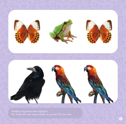 Tanıdığımız hayvanların ismini söyleyelim. Her sırada farklı olan hayvanı bulalım ve yuvarlak (O) içine alalım. 3