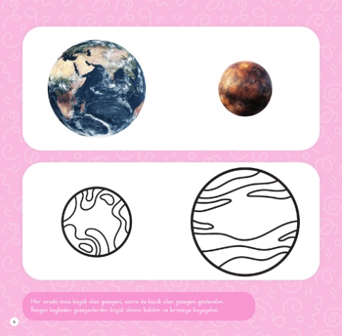 Her sırada önce büyük olan gezegeni, sonra da küçük olan gezegeni gösterelim. Rengini kaybeden gezegenlerden büyük olanını bulalım ve kırmızıya boyayalım. 4