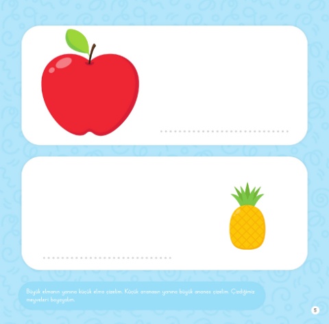 Büyük elmanın yanına küçük elma çizelim. Küçük ananasın yanına büyük ananas çizelim. Çizdiğimiz meyveleri boyayalım. 5
