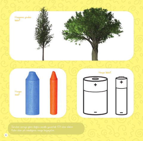 Hangisinin gövdesi kalın? Hangisi kalın? Hangisi ince? Sorulan soruya göre doğru cevabı yuvarlak (O) içine alalım. Kalın olan pili istediğimiz renge boyayalım. 6