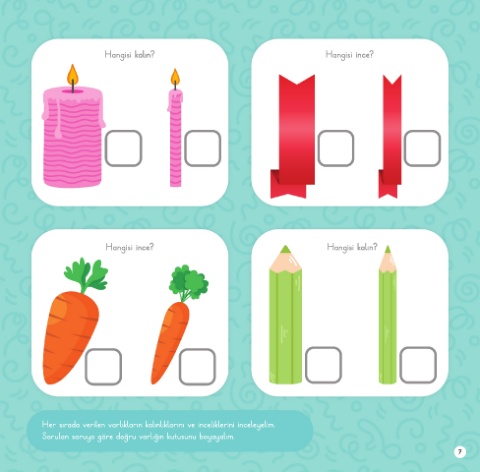 Hangisi kalın? Hangisi ince? Hangisi ince? Hangisi kalın? Her sırada verilen varlıkların kalınlıklarını ve inceliklerini inceleyelim. Sorulan soruya göre doğru varlığın kutusunu boyayalım. 7