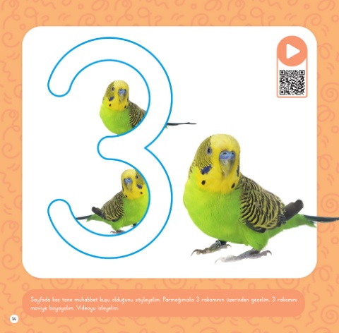 Sayfada kaç tane muhabbet kuşu olduğunu söyleyelim. Parmağımızla 3 rakamının üzerinden geçelim. 3 rakamını maviye boyayalım. Videoyu izleyelim. 14