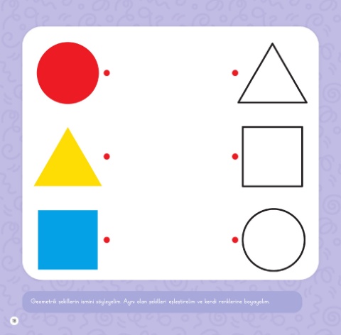 Geometrik şekillerin ismini söyleyelim. Aynı olan şekilleri eşleştirelim ve kendi renklerine boyayalım. 18