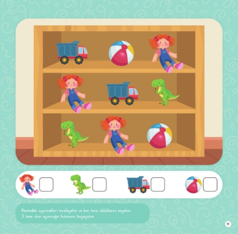 Resimdeki oyuncakları inceleyelim ve kaç tane olduklarını sayalım. 3 tane olan oyuncağın kutusunu boyayalım. 19