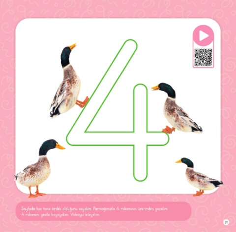 Sayfada kaç tane ördek olduğunu sayalım. Parmağımızla 4 rakamının üzerinden geçelim. 4 rakamını yeşile boyayalım. Videoyu izleyelim. 21