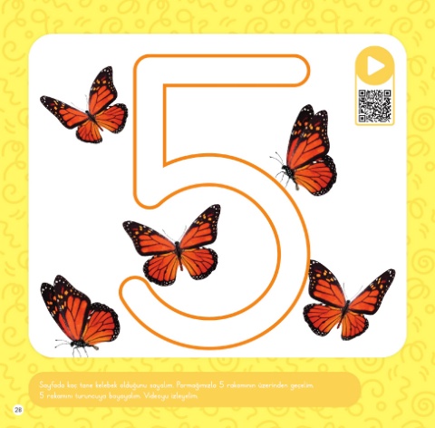 Sayfada kaç tane kelebek olduğunu sayalım. Parmağımızla 5 rakamının üzerinden geçelim. 5 rakamını turuncuya boyayalım. Videoyu izleyelim. 28
