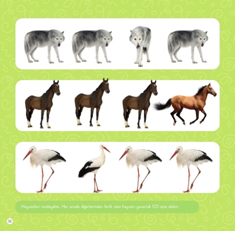 Hayvanları inceleyelim. Her sırada diğerlerinden farklı olan hayvanı yuvarlak (O) içine alalım. 32