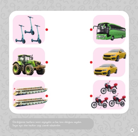 Gördüğümüz taşıtların ismini söyleyelim ve kaç tane olduğunu sayalım. Sayısı aynı olan taşıtları çizgi çizerek eşleştirelim. 35