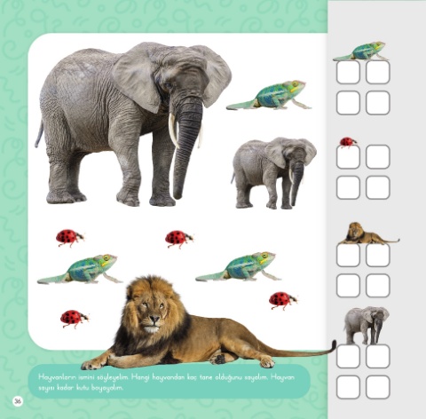 Hayvanların ismini söyleyelim. Hangi hayvandan kaç tane olduğunu sayalım. Hayvan sayısı kadar kutu boyayalım. 36