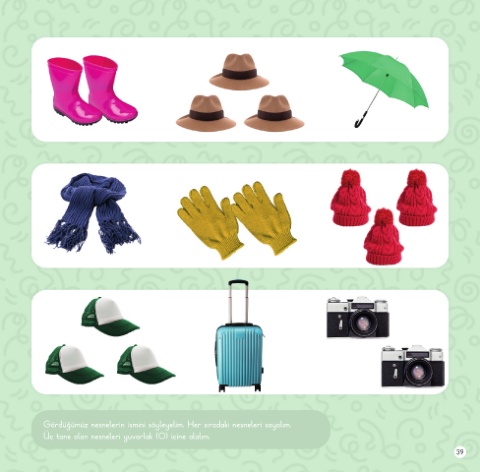 Gördüğümüz nesnelerin ismini söyleyelim. Her sıradaki nesneleri sayalım. Üç tane olan nesneleri yuvarlak (O) içine alalım. 39