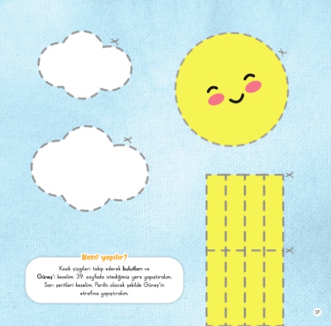 Nasıl yapılır? Kesik çizgileri takip ederek bulutları ve Güneş'i keselim. 39. sayfada istediğimiz yere yapıştıralım. Sarı şeritleri keselim. Parıltı olacak şekilde Güneş'in etrafına yapıştıralım. 37