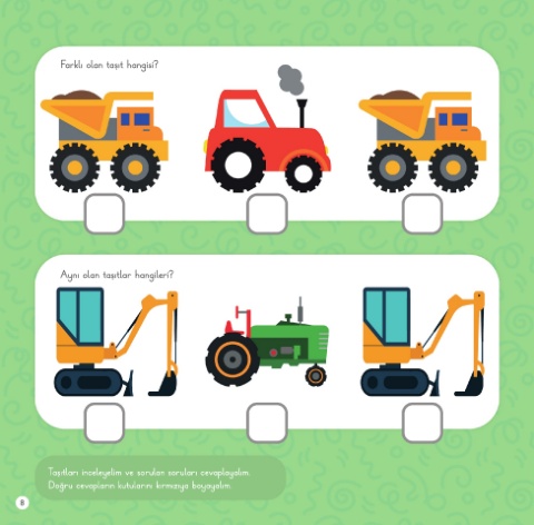 Farklı olan taşıt hangisi? Aynı olan taşıtlar hangileri? Taşıtları inceleyelim ve sorulan soruları cevaplayalım. Doğru cevapların kutularını kırmızıya boyayalım. 8