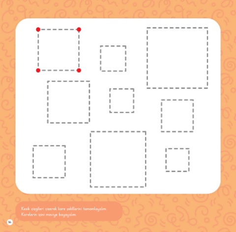 Kesik çizgileri çizerek kare şekillerini tamamlayalım. Karelerin içini maviye boyayalım. 14
