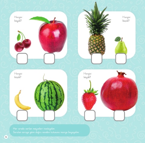 3 Hangisi Hangisi büyük? küçük? Hangisi Hangisi küçük? büyük? Her sırada verilen meyveleri inceleyelim. Sorulan soruya göre doğru cevabın kutusunu maviye boyayalım. 16
