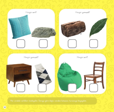 Hangisi sert? Hangisi yumuşak? Hangisi yumuşak? Hangisi sert? Her sıradaki varlıkları inceleyelim. Soruya göre doğru cevabın kutusunu turuncuya boyayalım. 28
