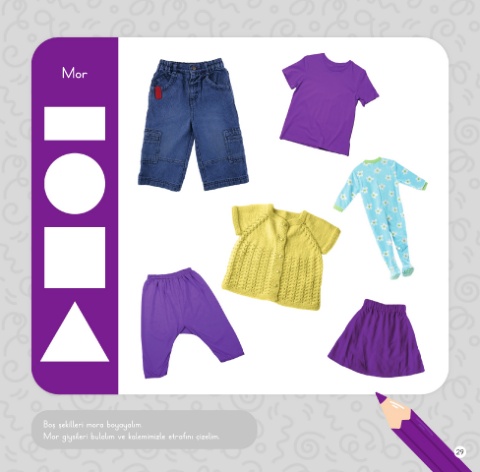 Mor Boş şekilleri mora boyayalım. Mor giysileri bulalım ve kalemimizle etrafını çizelim. 29