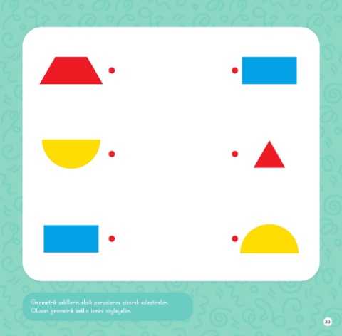 Geometrik şekillerin eksik parçalarını çizerek eşleştirelim. Oluşan geometrik şeklin ismini söyleyelim. 33